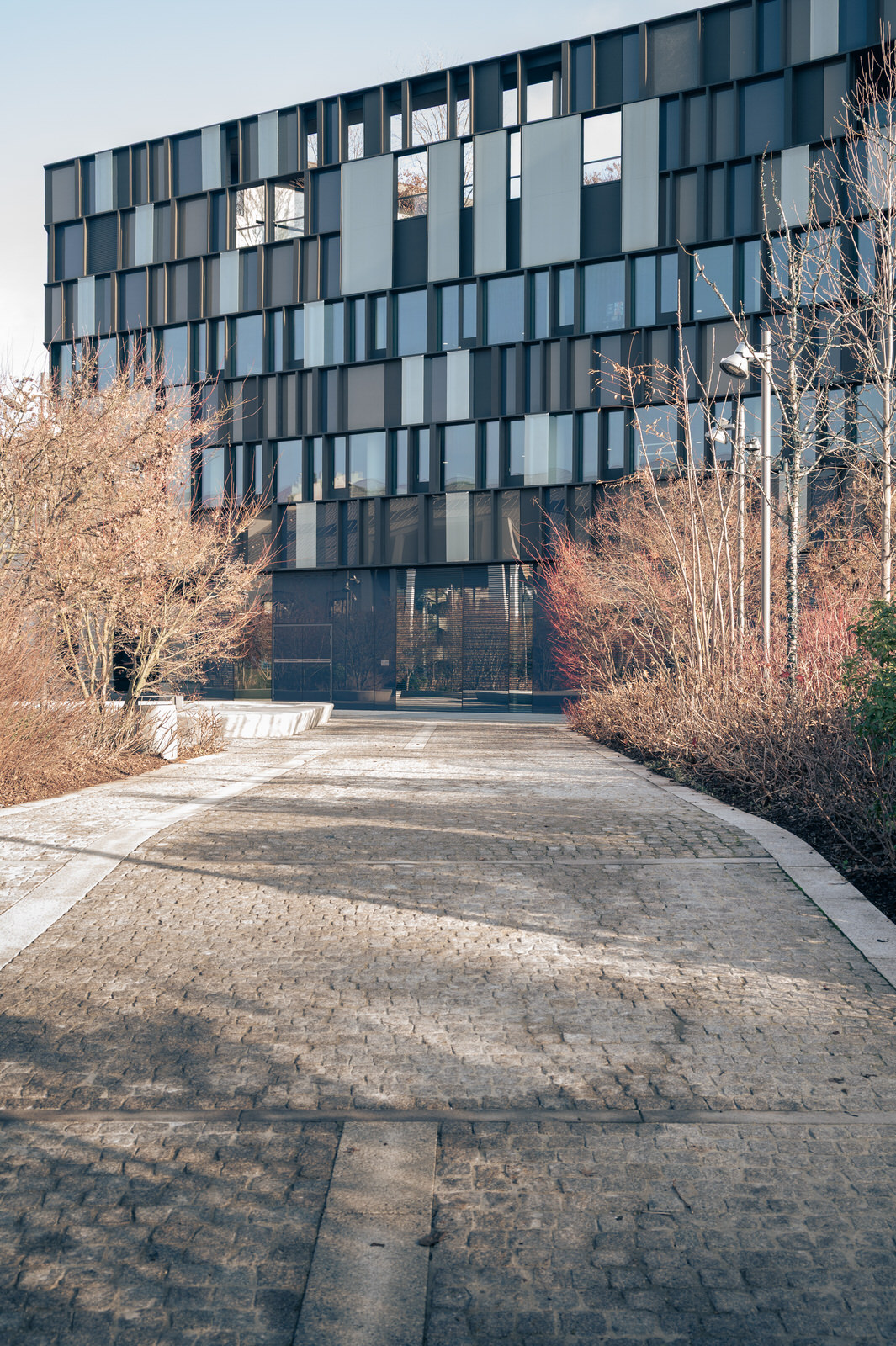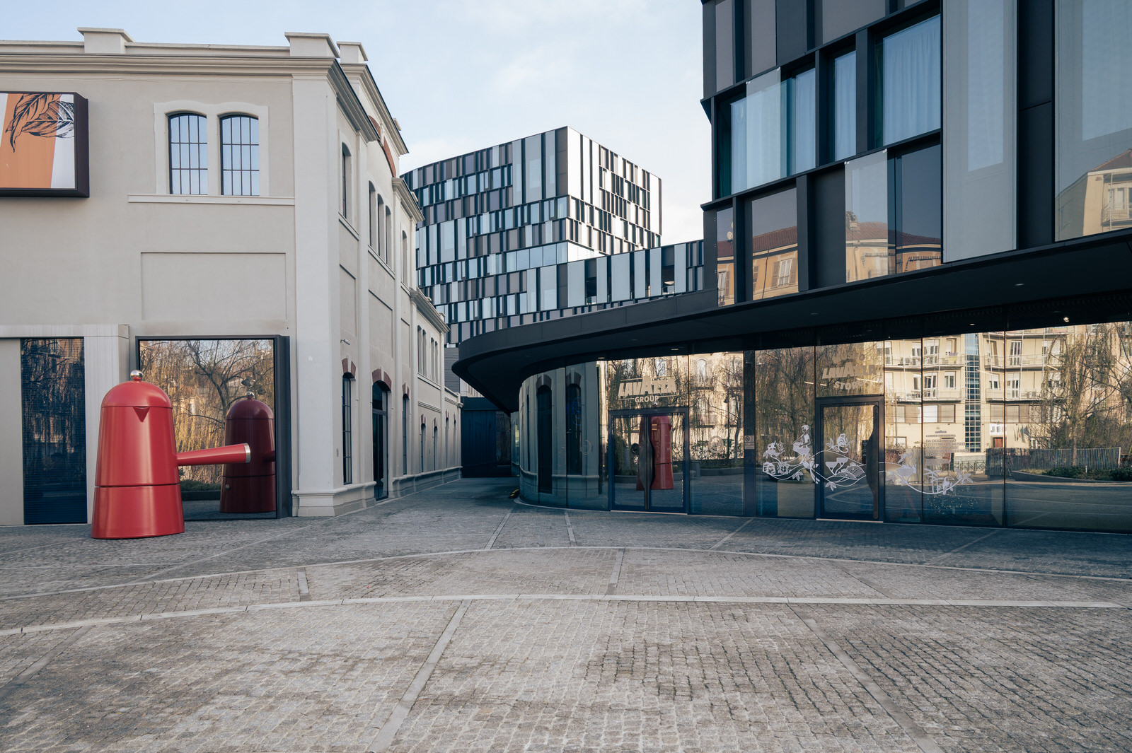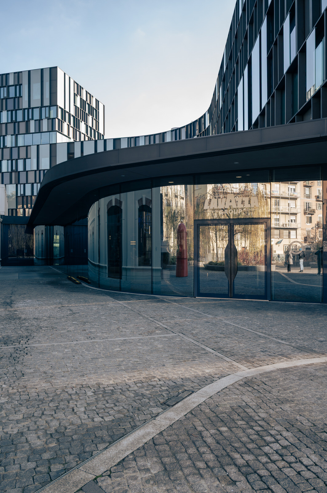The building introduces a contemporary architectural language within a layered urban context, establishing a relationship between the new volume and the surrounding historic fabric.