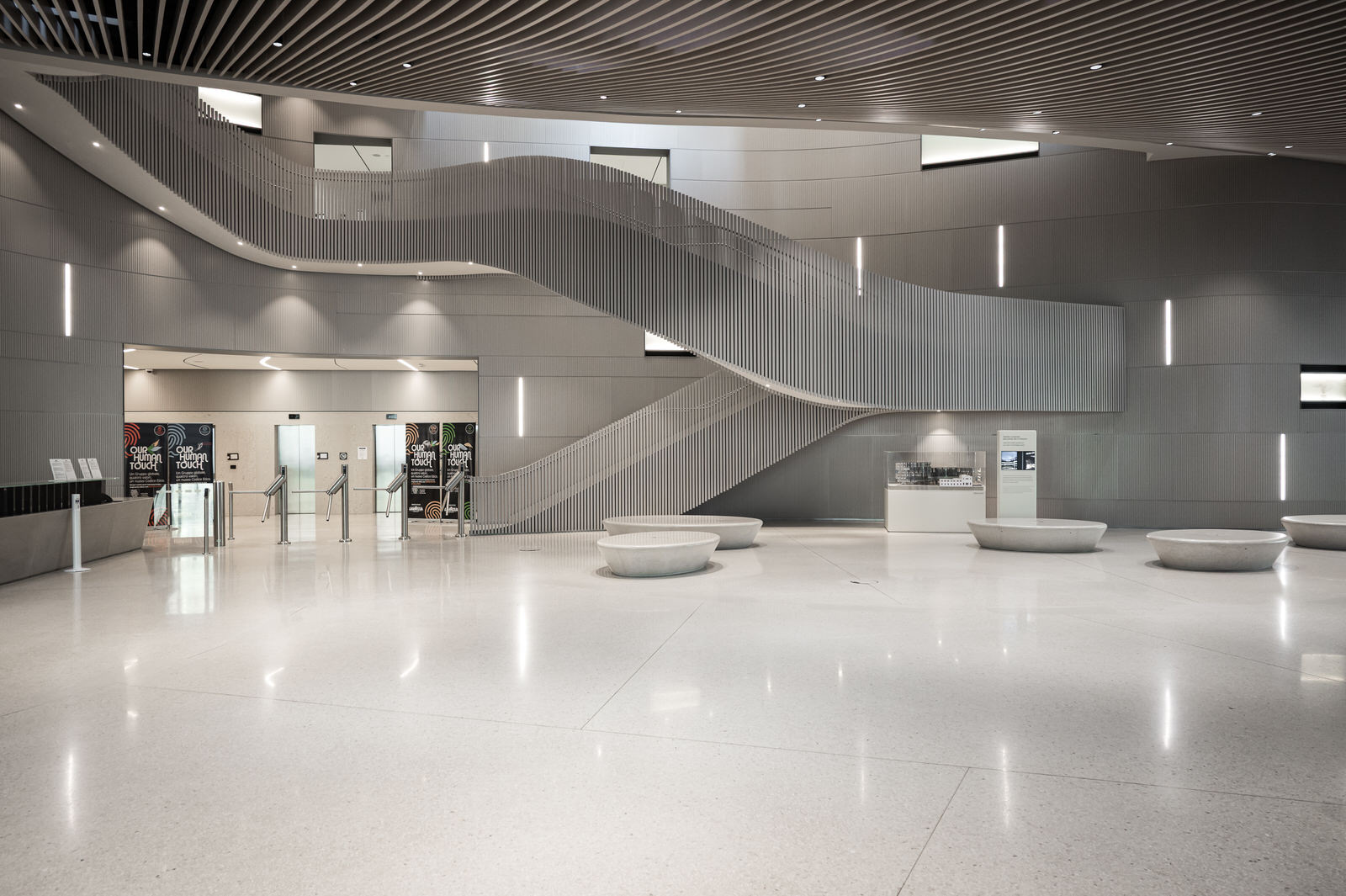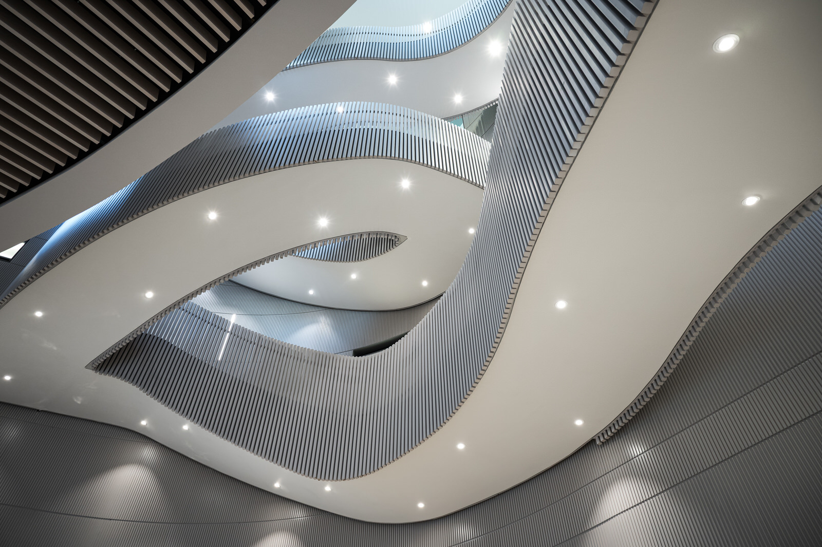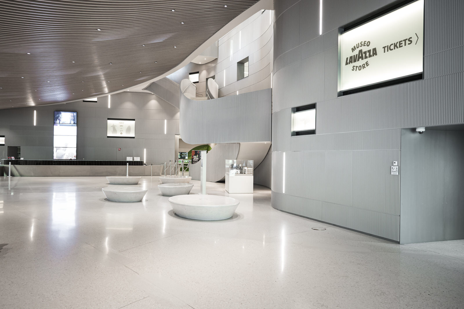 All’interno, lo spazio si sviluppa attraverso forme fluide e continue, in contrasto con la geometria più compatta dell’esterno.