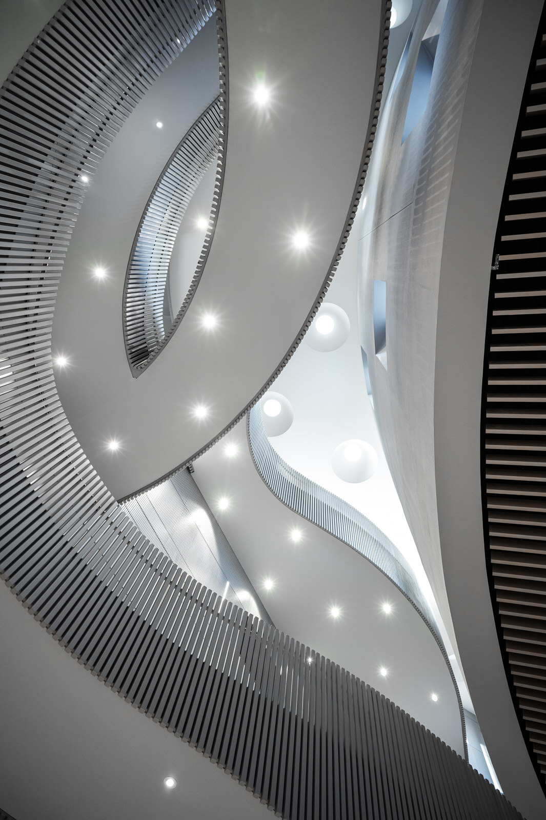Inside, the space unfolds through fluid, continuous forms, in contrast with the more compact geometry of the exterior.